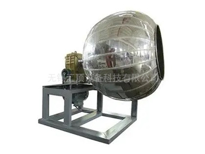 為使芯片盡快在其表面均勻涂上包衣結(jié)晶,并達(dá)到拋光目的,須先對鍋內(nèi)芯片分次噴糖漿,再通過鍋體順時(shí)針旋轉(zhuǎn),使糖衣片在鍋內(nèi)翻滾、磨擦、研磨,使糖衣均勻。同時(shí)向鍋內(nèi)通入熱風(fēng),迅速除去藥片糖衣表層水份,獲得包裹均勻、光滑的糖衣片。本機(jī)是糖衣工藝的常用設(shè)備,以穩(wěn)定的鍋體線速度旋轉(zhuǎn),使藥片在鍋內(nèi)形成拋物曲線,達(dá)到糖衣層厚薄均勻,色澤光亮,不發(fā)生麻點(diǎn)的工藝要求。