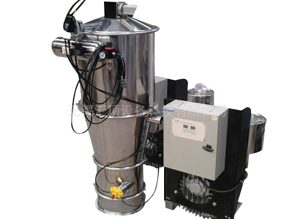真空上料機(jī)是用旋渦氣泵抽氣,使吸料嘴進(jìn)口處及整個(gè)系統(tǒng)處于一定的真空狀態(tài),粉粒料隨同外界空氣被吸入料嘴,形成料氣流,經(jīng)過(guò)吸料管到達(dá)料斗,在料斗中進(jìn)行氣、料分離。分離后的物料進(jìn)入受料設(shè)備。送料——放料是通過(guò)氣動(dòng)三通閥不斷地開、閉來(lái)完成的,而氣動(dòng)三通閥的開閉是由控制中心來(lái)控制的。