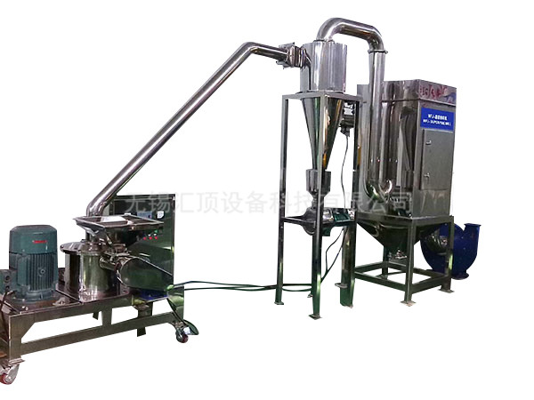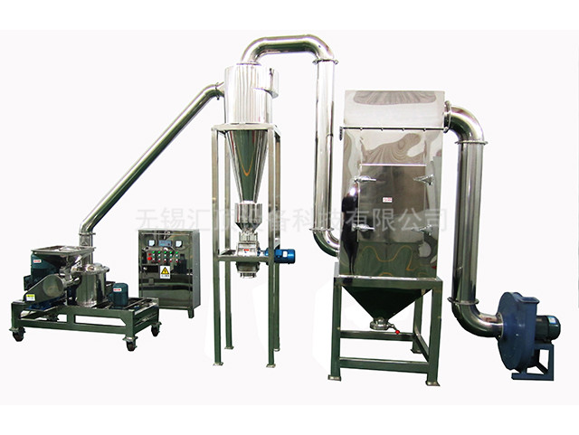 WFJ型超微粉碎機結構設計緊湊,外形美觀,外殼采用不銹鋼制造,機內裝有分級輪,能同時完成超微粉碎和微粒篩選兩道工序,該機采用雙水冷和風冷卻構造,在粉碎作業是主機不升溫,可粉碎各種熱敏性物料,且內部與物料接觸磨損位可采用耐磨剛玉陶瓷制作,該設備應用于食品,只要,化工,電池,非金屬,金屬等各種粉體材料的加工粉碎。該機由主機,輔機,電箱,除塵器,收集料倉等組成,具有風選式、無篩、無網,粒度均勻等優點,生產過程連續進行。物料由料斗進螺旋輸送器進入粉碎室,被高速旋轉的刀片剪切粉碎,通過負壓風運的方法把物料運入旋風分離器,帶式除塵器,粉碎刀盤與分級輪轉速采用變頻控制,產品粒徑可通過調節粉碎室刀盤及分級輪的轉速來控制,過程實現自動化。